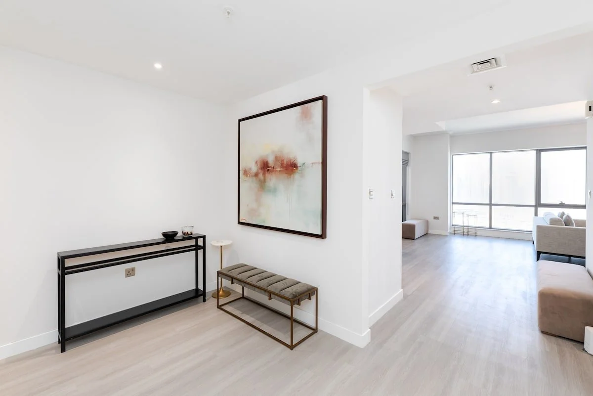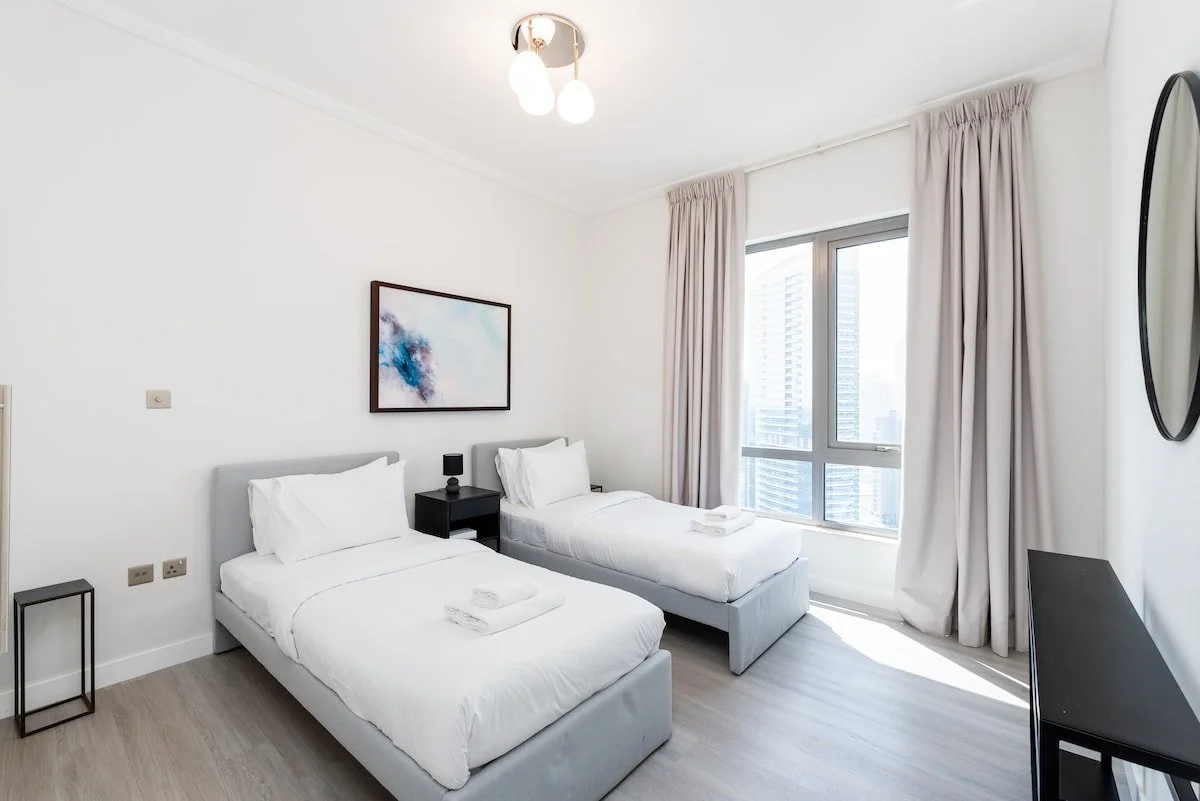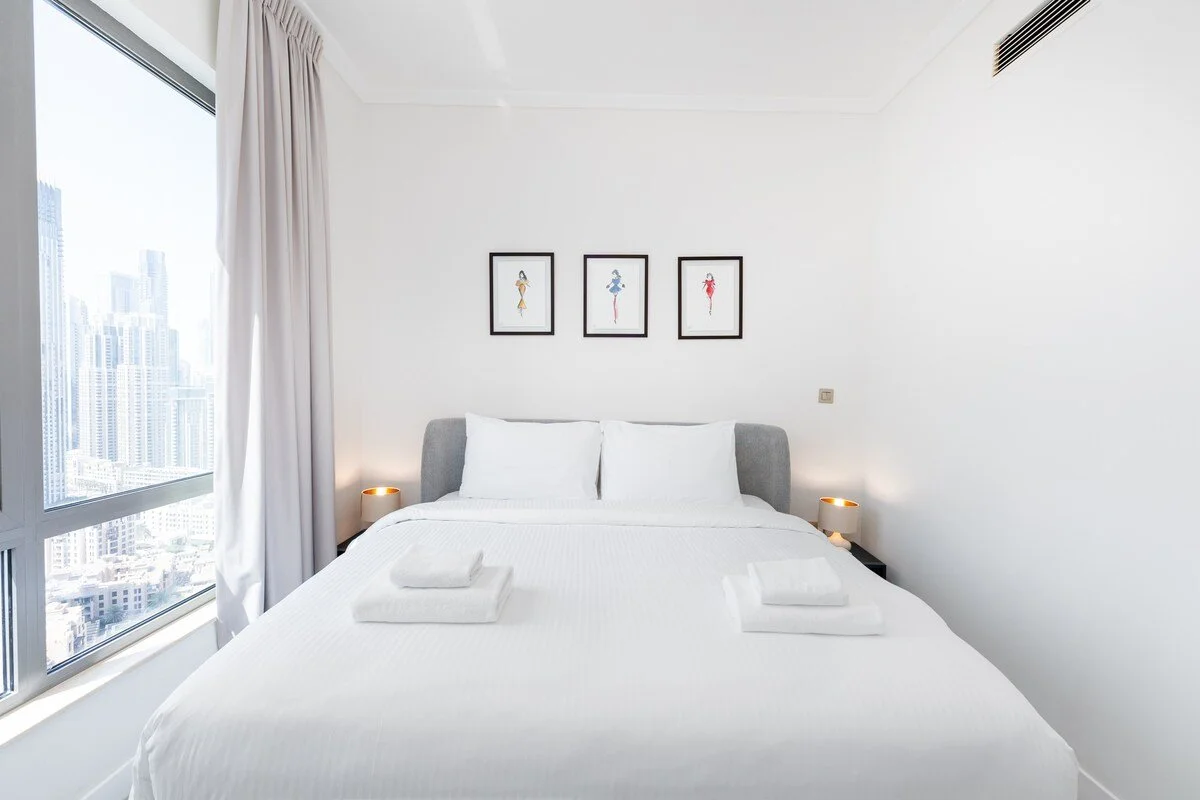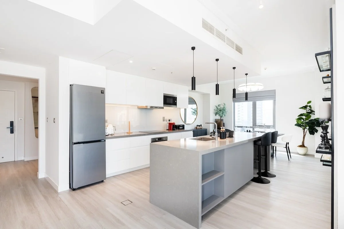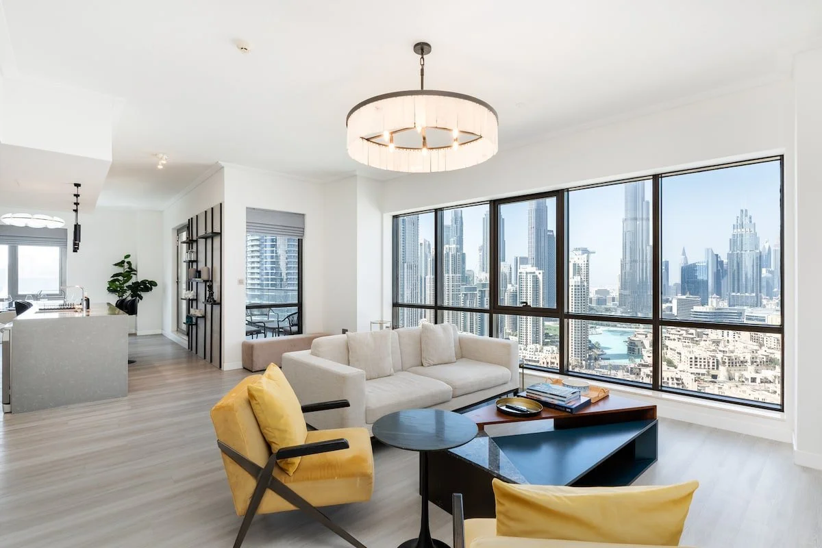 Jala is an upscale 3 + 1‑bedroom apartment located in the heart of Downtown Dubai, offering sweeping views of the Burj Khalifa. The home comfortably hosts up to 7 guests across three principal bedrooms and an additional maid’s room. Floor‑to‑ceiling windows and a private balcony flood the open‑plan living area with light and provide unobstructed vistas of Dubai’s skyline. Interiors are spacious and modern, blending neutral tones with high‑end finishes. A fully equipped kitchen with an island and bar stools is perfect for cooking and socialising, while the adjacent lounge invites you to relax with Netflix or a good book. Situated within walking distance of restaurants, shops and entertainment venues, Jala delivers a sophisticated urban lifestyle with all the comforts of home.