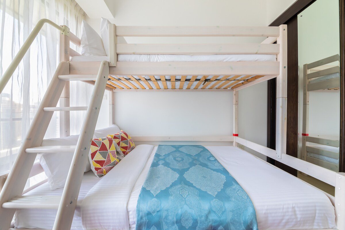 Bedroom 3: Equipped with a bunk bed (queen on the bottom, single on top), built‑in wardrobes and balcony access; en‑suite bathroom with shower.