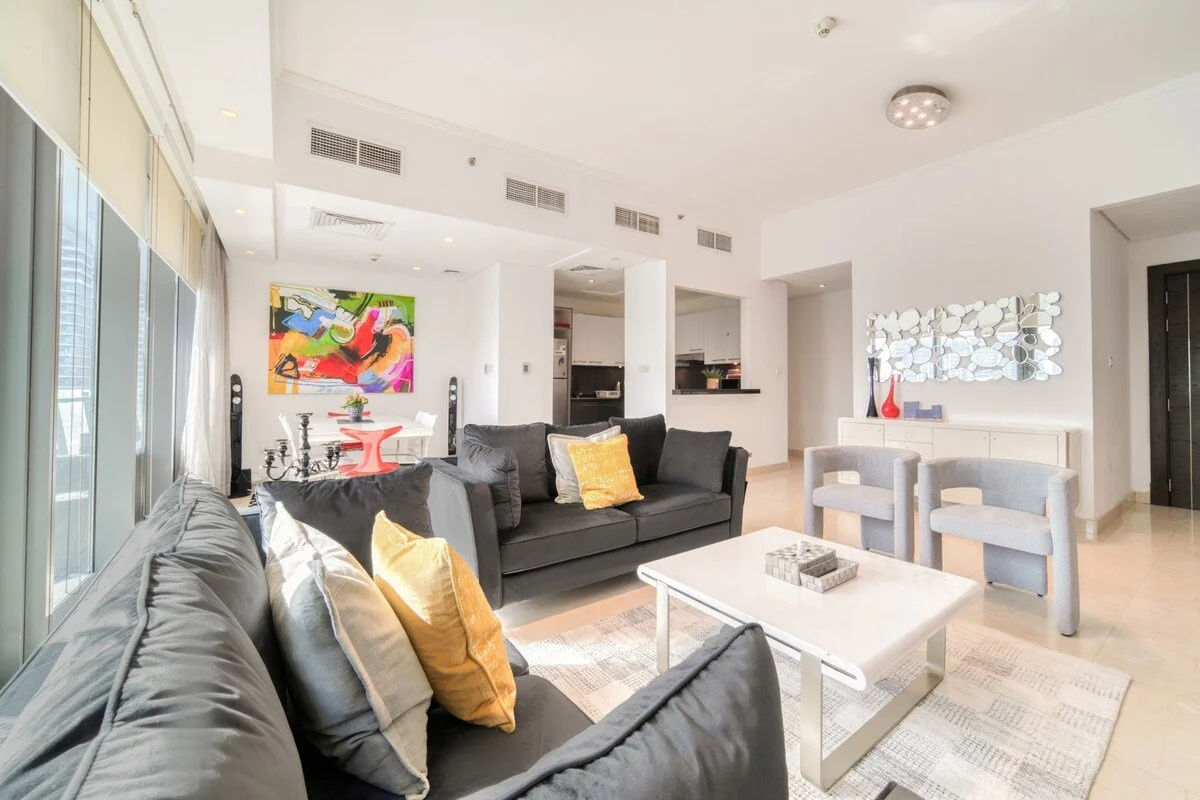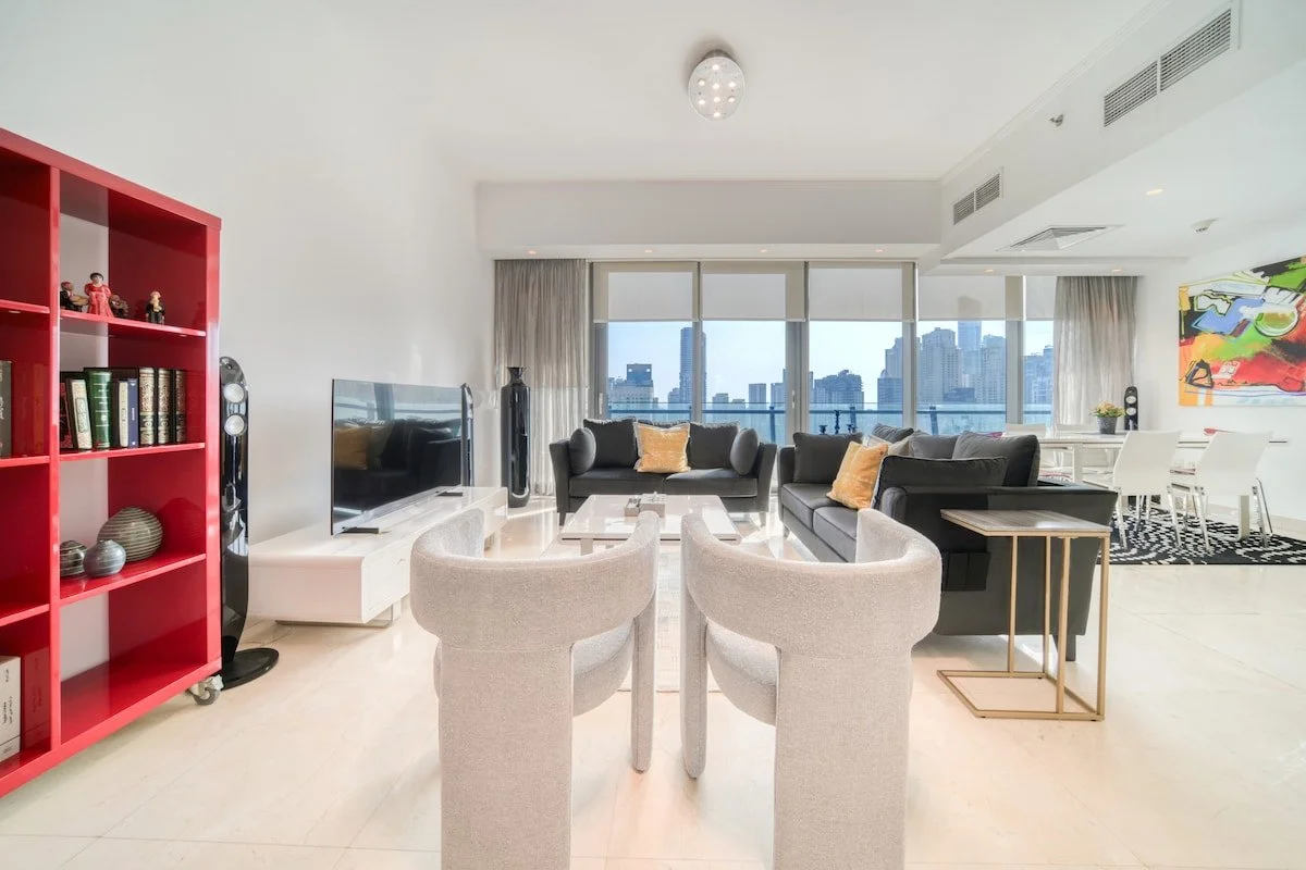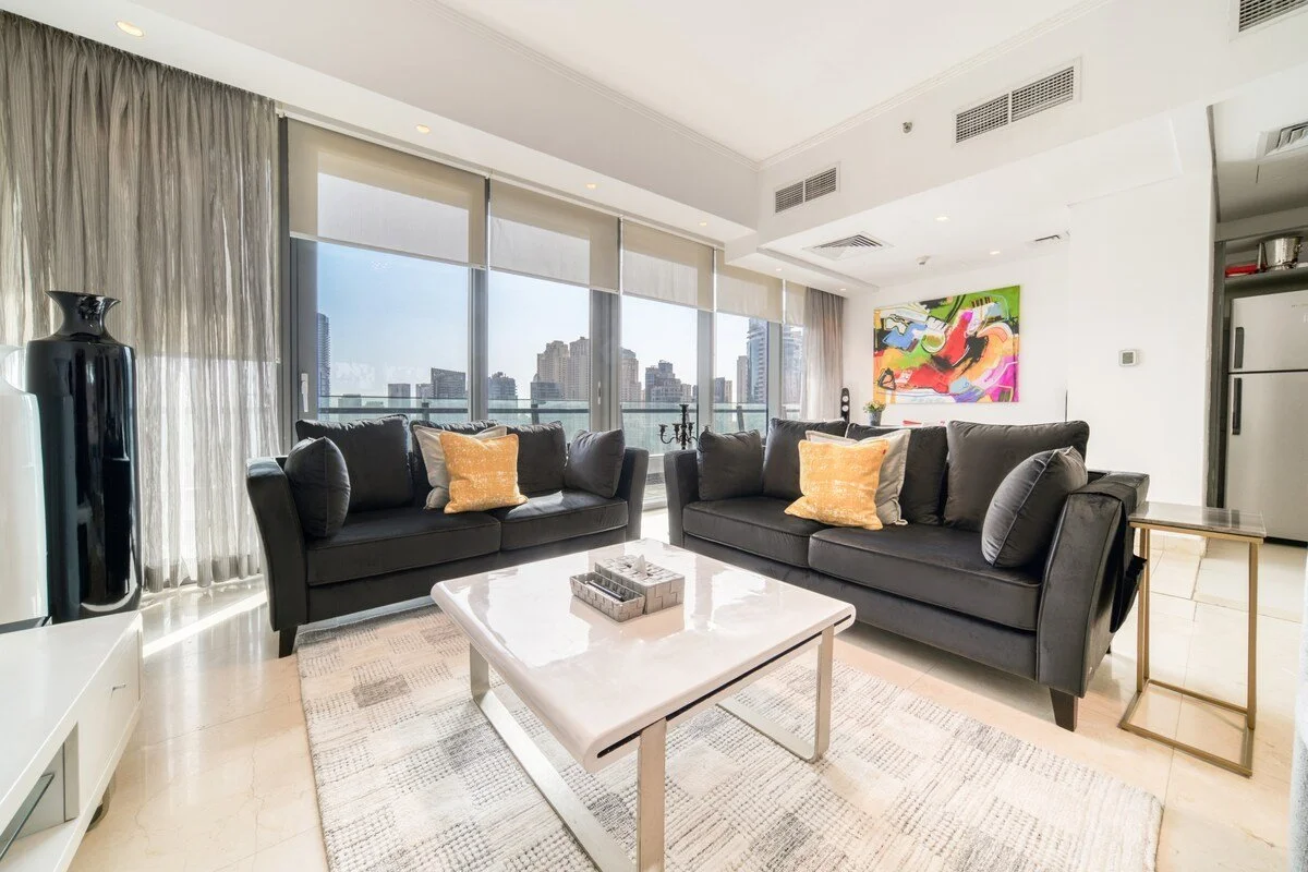 Ojos is a large, bright and luxurious three‑bedroom apartment overlooking Dubai Marina and just a short walk from JBR Beach. Managed by Mint Stay, the apartment hosts up to 7 guests across three bedrooms and offers a full marina view from its furnished balcony. The open‑plan living area features a spacious corner sofa, flat‑screen TV and dining table for four, with sliding doors leading to the balcony. A fully equipped kitchen with a breakfast bar provides all the appliances you need for a comfortable stay. Floor‑to‑ceiling windows fill the space with natural light. The location invites you to stroll along the marina walkway to Dubai Marina Mall, enjoy lunch at Pier 7, charter a yacht to Palm Jumeirah or explore the lively JBR beach, all within minutes of your door.