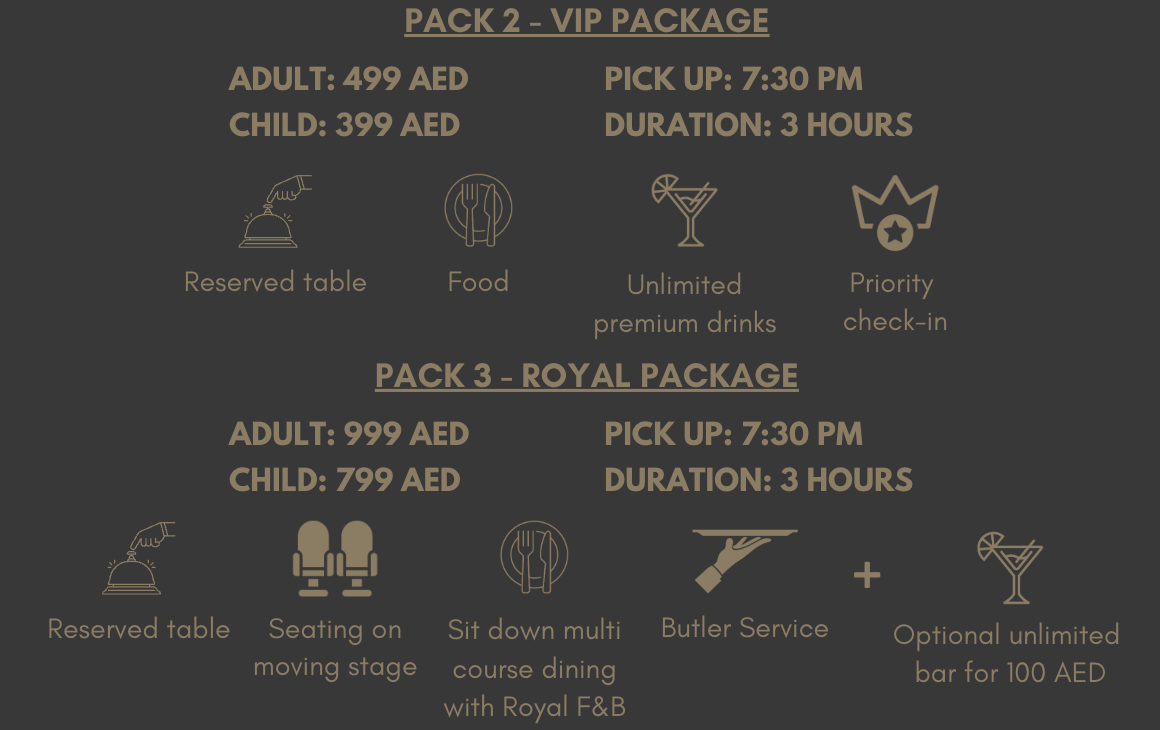 Step aboard the Ocean Empress, Dubai’s largest floating restaurant, and enjoy stunning views of Marina, JBR, Bluewaters and the Palm. Indulge in a rich international buffet with live cooking stations, while a DJ and cultural performances set the perfect evening mood. With options from classic dining to exclusive VIP seating, this dinner cruise promises an unforgettable night on Dubai’s waters.