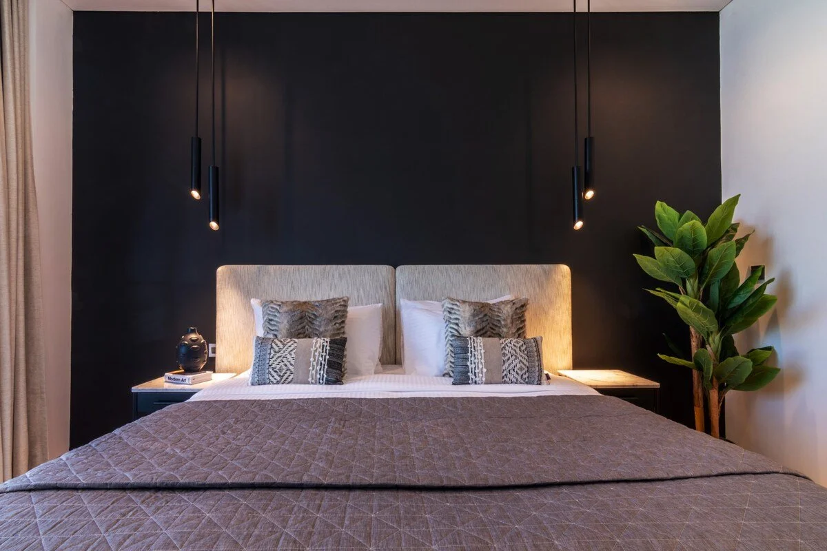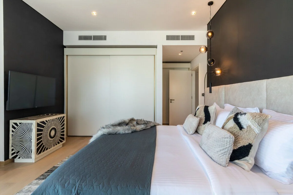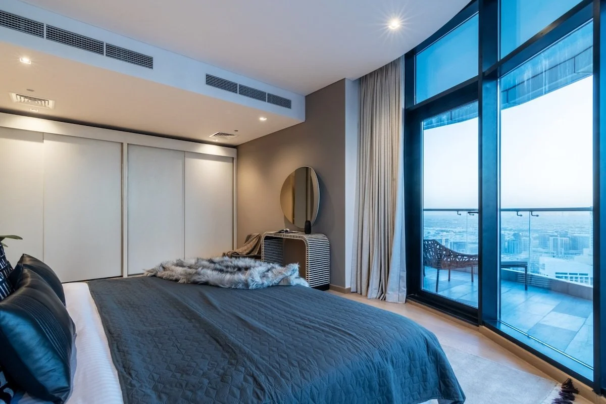 Six luxurious bedrooms, each with en‑suite bathroom and ample closet space, sleep up to 13 guests. The master suite enjoys a private balcony and unobstructed skyline views, while other bedrooms feature king or queen beds and stylish furnishings.