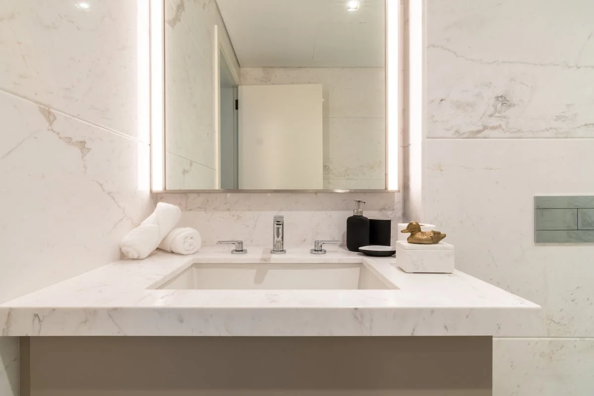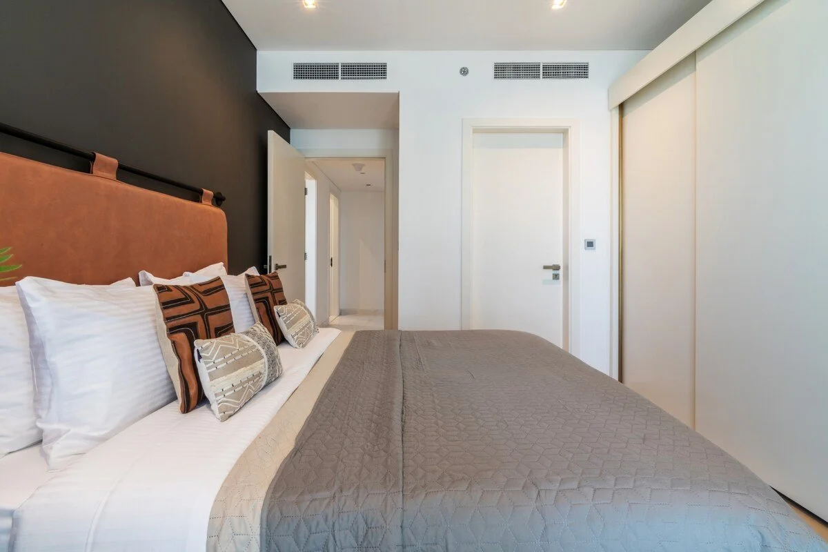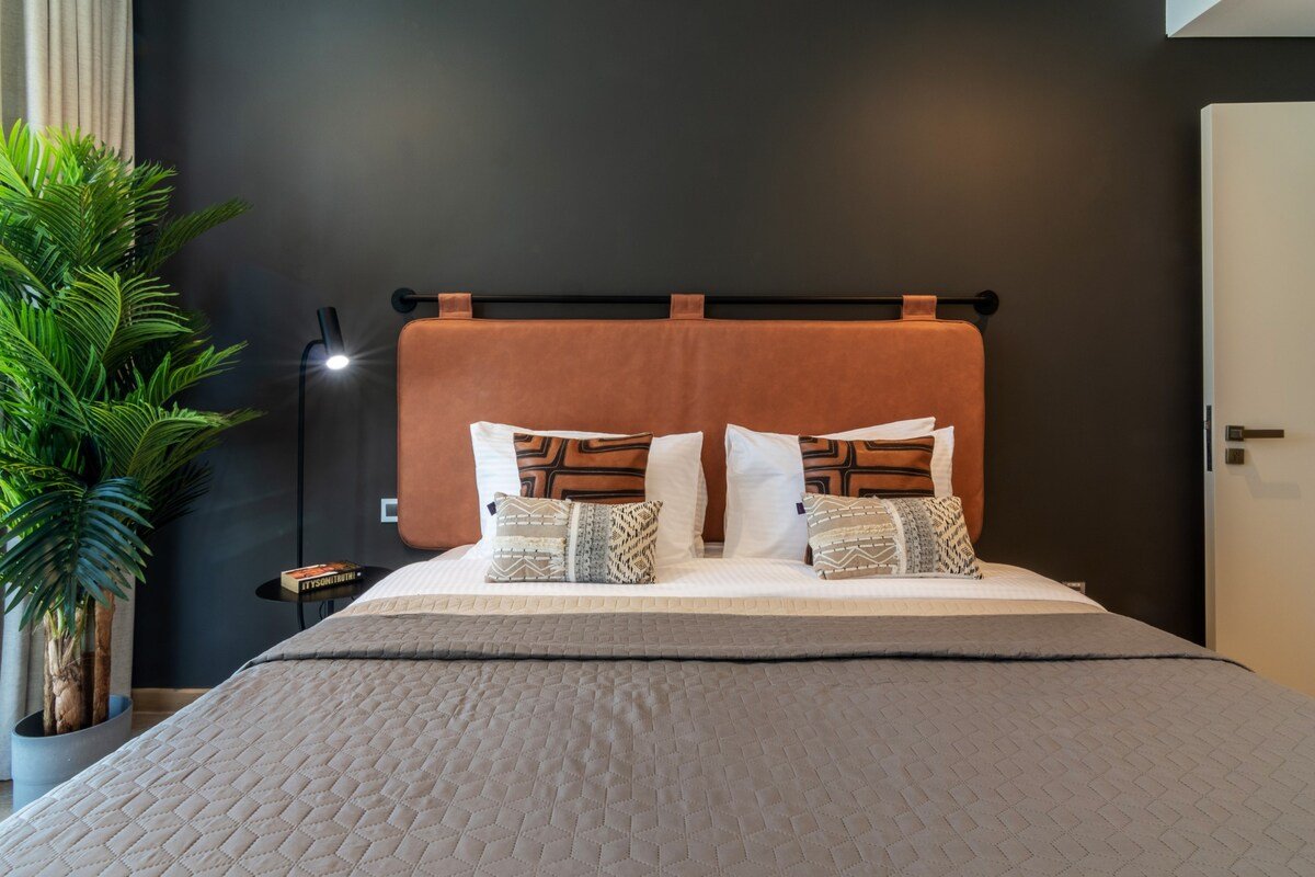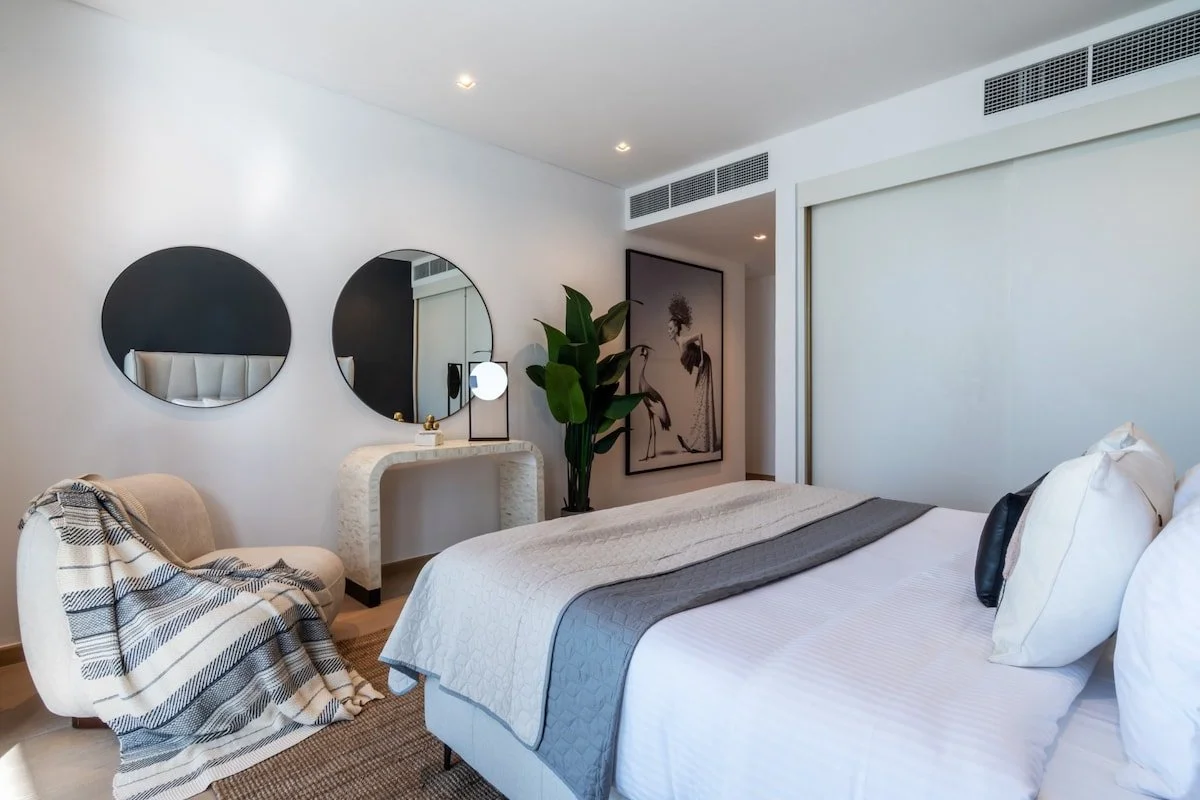 Six luxurious bedrooms, each with en‑suite bathroom and ample closet space, sleep up to 13 guests. The master suite enjoys a private balcony and unobstructed skyline views, while other bedrooms feature king or queen beds and stylish furnishings.