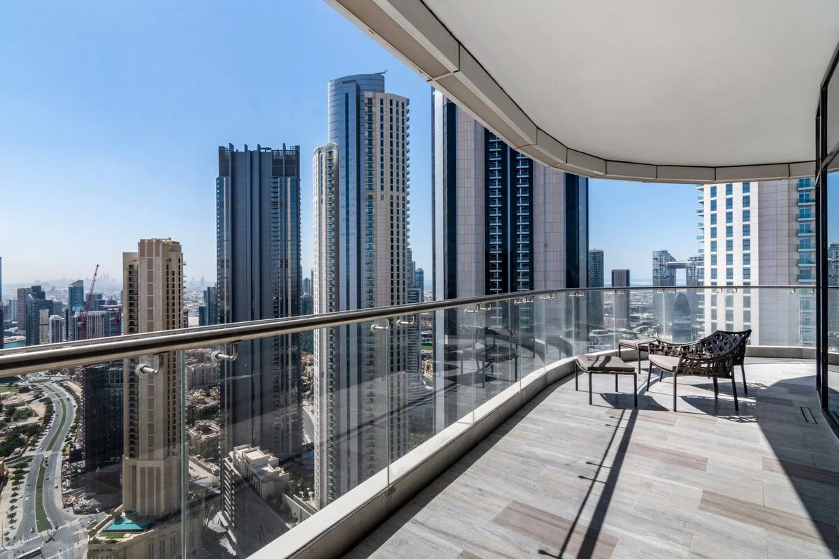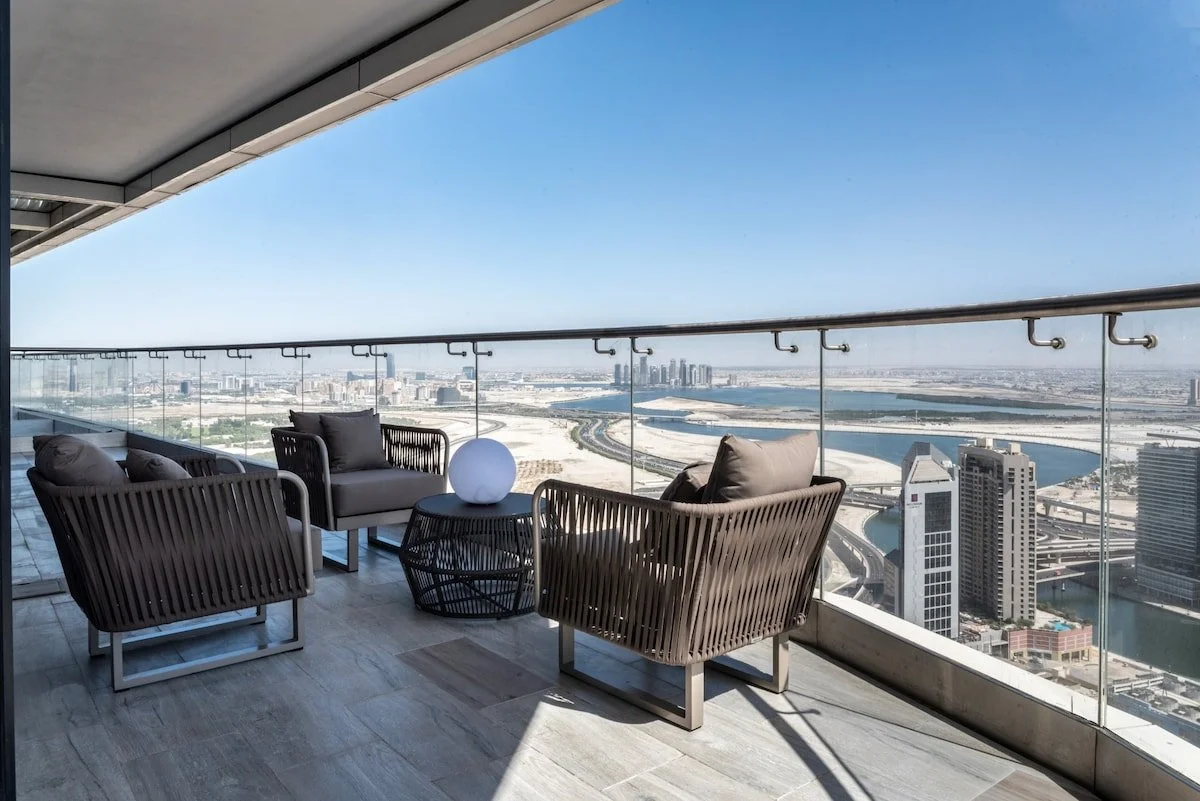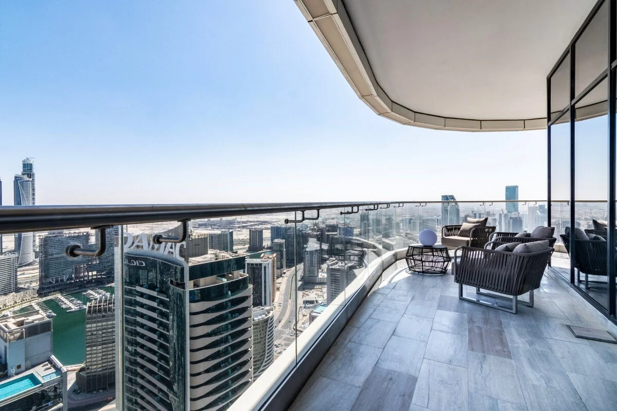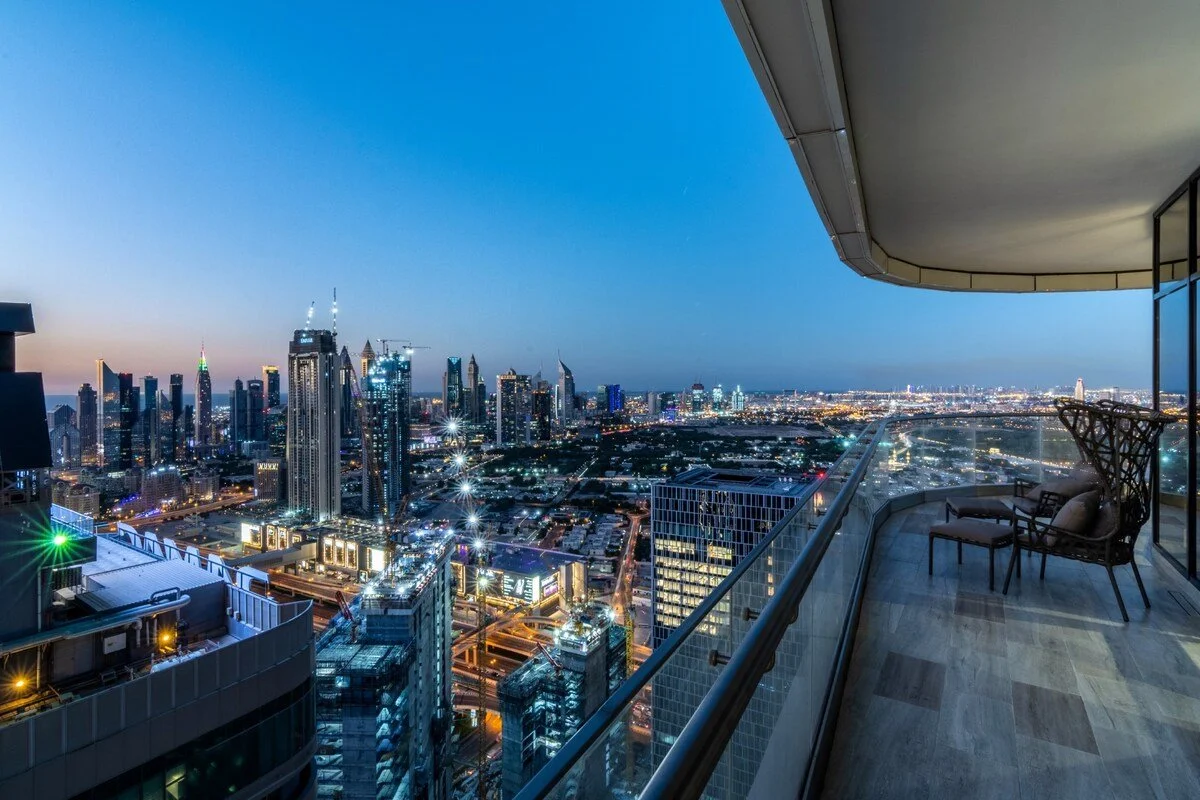 Wrap‑around balconies and floor‑to‑ceiling windows provide 360‑degree views of Dubai. Residents also have access to an exclusive sky lounge, sun deck and pool facilities on higher levels of the building.