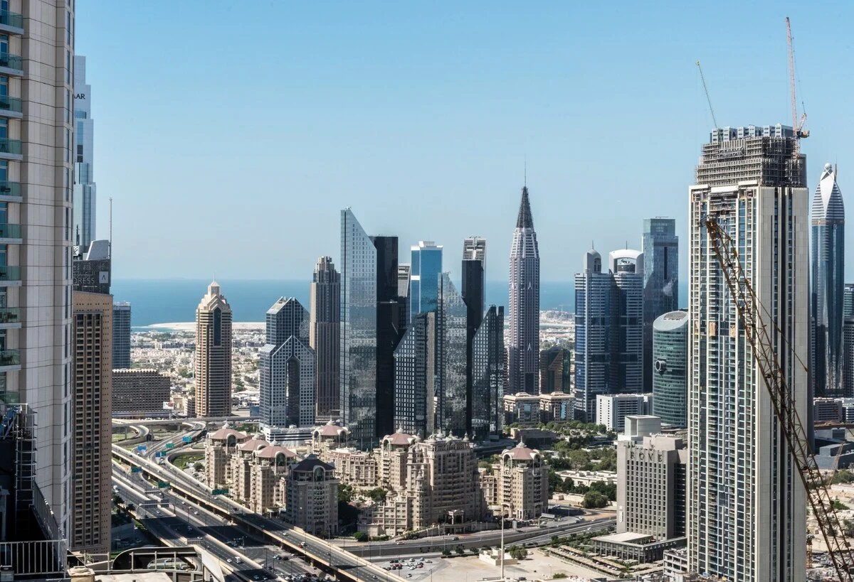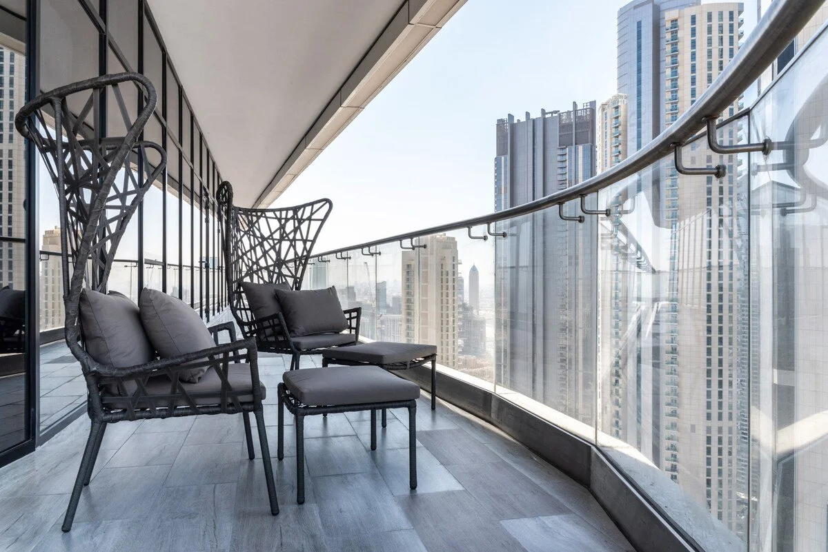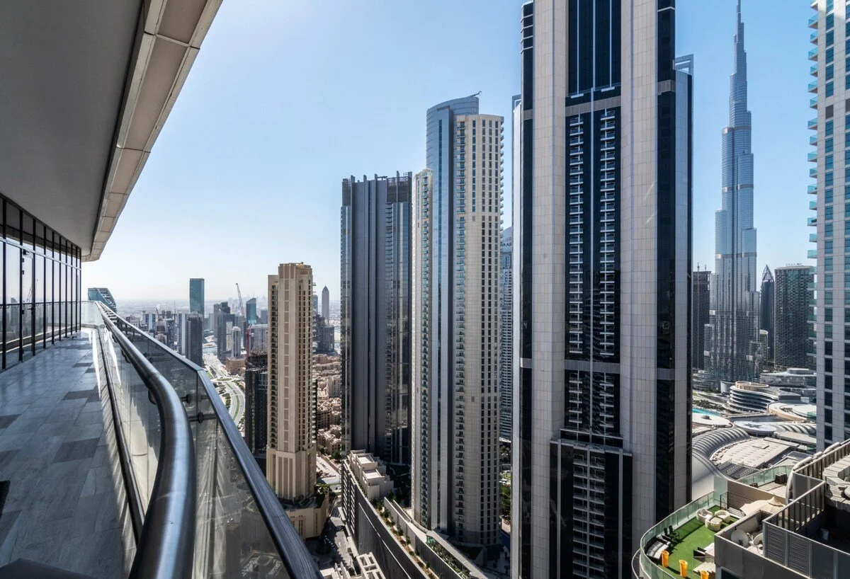 Wrap‑around balconies and floor‑to‑ceiling windows provide 360‑degree views of Dubai. Residents also have access to an exclusive sky lounge, sun deck and pool facilities on higher levels of the building.