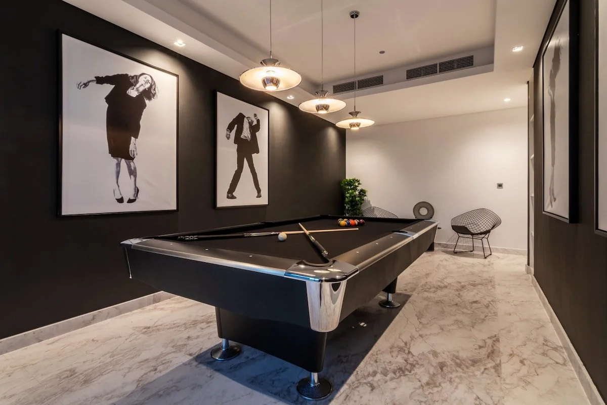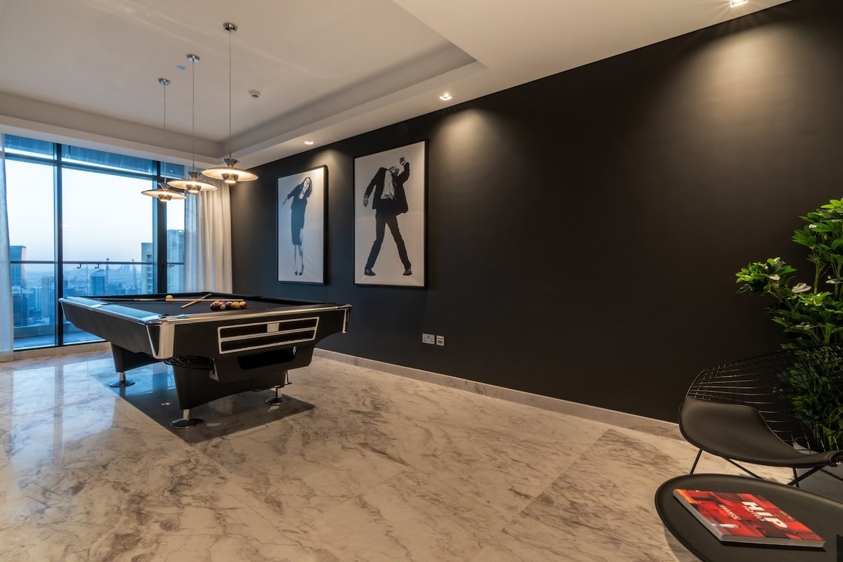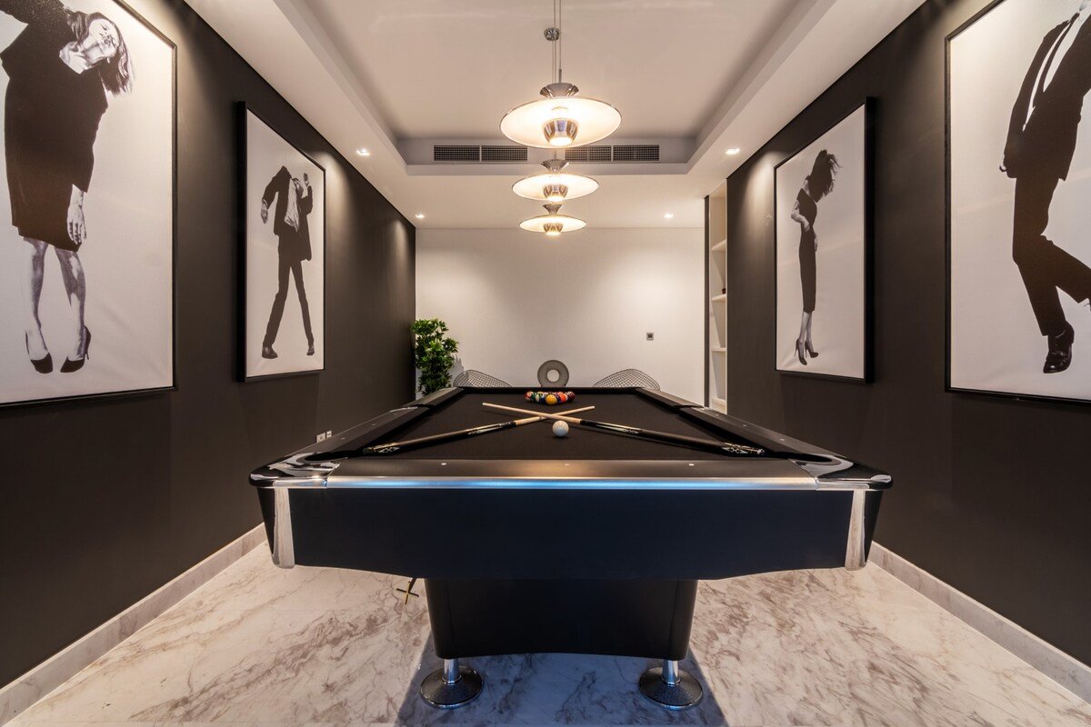 A palatial living room anchors the penthouse, complemented by a formal dining space for up to 14 guests. Additional lounges include a bar area and a billiards room, creating varied settings for socialising.