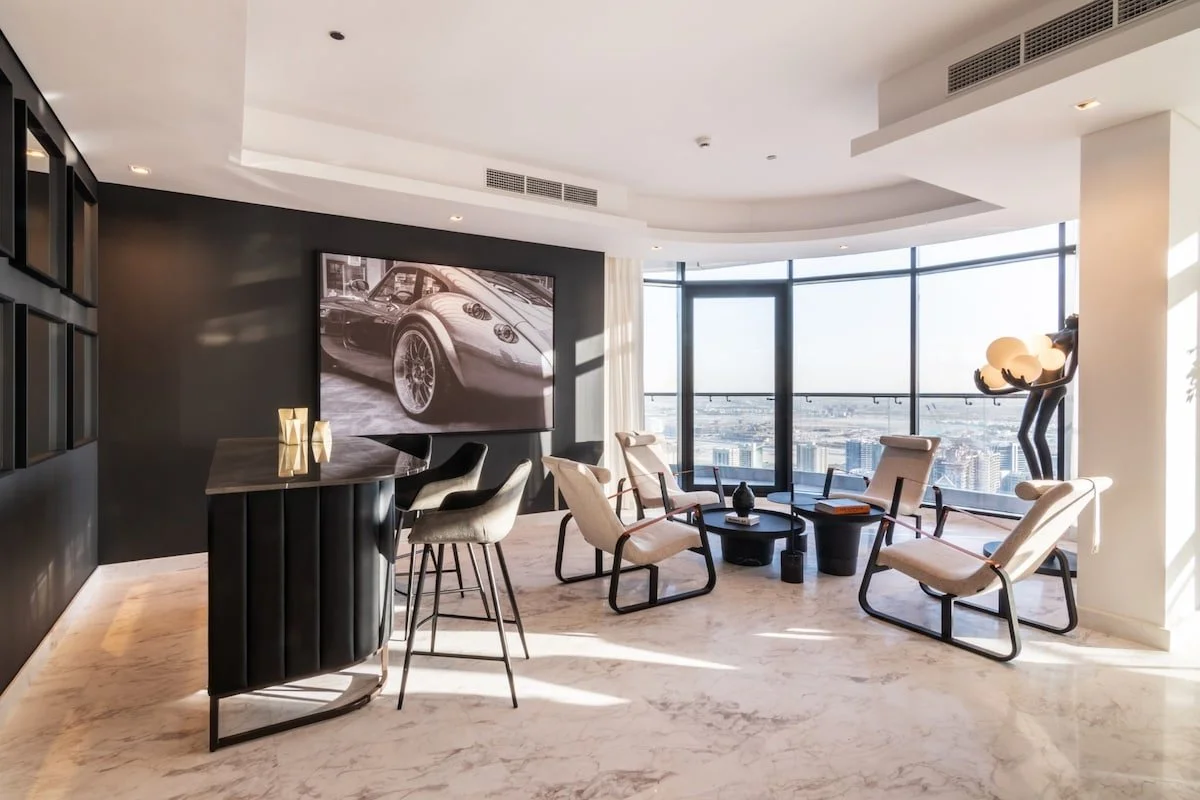 Penthouse Lara occupies an entire high floor of RP Heights, a new luxury tower in the heart of Downtown Dubai. Designed as a grand urban retreat, this six‑bedroom residence spans a full floor and features panoramic windows and wrap‑around balconies that showcase sweeping views across the city, from Dubai Marina and the Burj Al Arab to Dubai Creek and the Burj Khalifa. The layout emphasises social spaces: a vast living room flows into a dining area that seats 14, while separate lounge, bar and billiards rooms offer multiple zones for entertaining. A closed Miele‑equipped kitchen, maid’s room and high‑speed lift access add practicality. Guests also enjoy exclusive use of the building’s sky lounge, sun deck and pool facilities. Set between Dubai Mall and Business Bay, Penthouse Lara combines privacy, scale and a prime location.