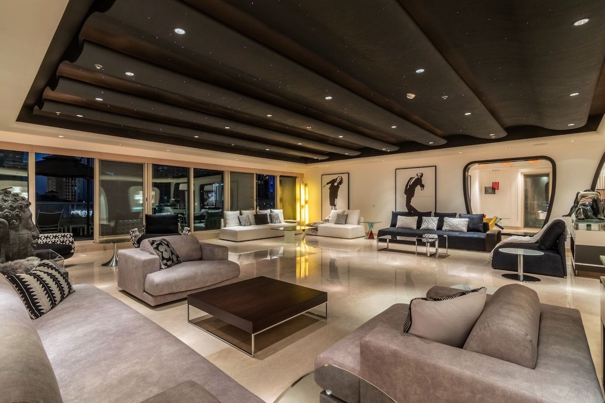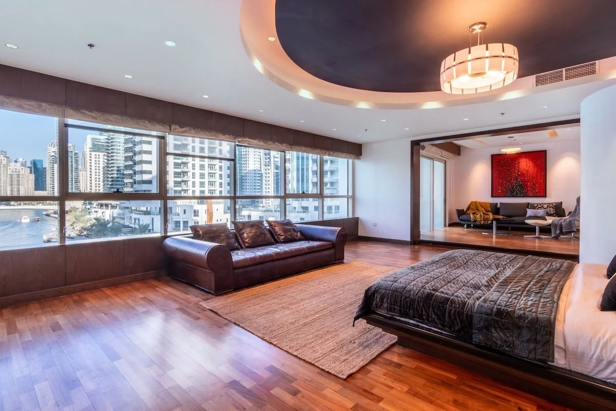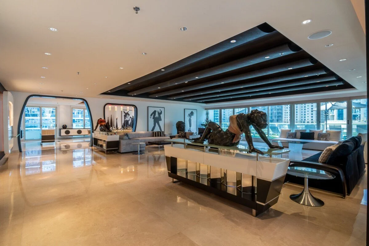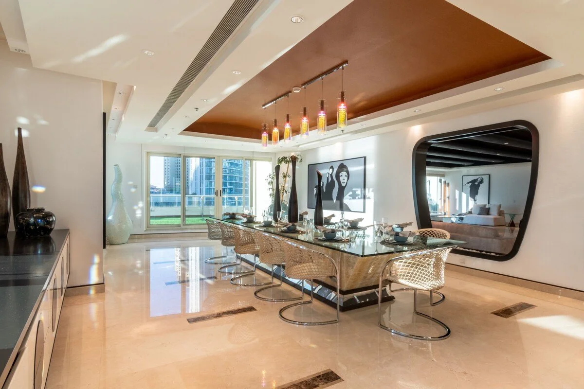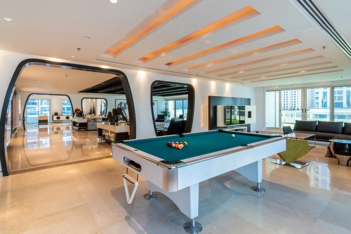 Penthouse Lojo is a full‑floor residence crowning a tower in Dubai Marina. Designed for large groups or families, it spans an entire level and boasts floor‑to‑ceiling windows that frame panoramic views of the marina and city skyline. The open‑plan layout features a vast living room with multiple seating areas, a dining table for 12 guests and a separate lounge with a billiards table and bar. A closed gourmet kitchen supports both casual meals and formal entertaining, while a maid’s room adds convenience for long stays. Contemporary interiors blend neutral tones with sleek finishes, and a wrap‑around balcony invites outdoor lounging above the waterfront. Residents also enjoy access to the building’s shared pool, gym and sun deck. With its expansive footprint and prime location, Penthouse Lojo delivers a luxurious urban retreat in the heart of Dubai Marina.