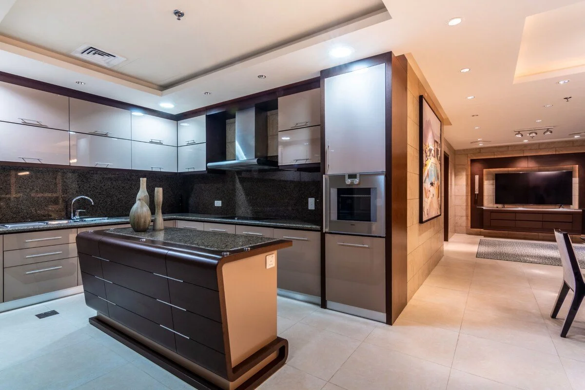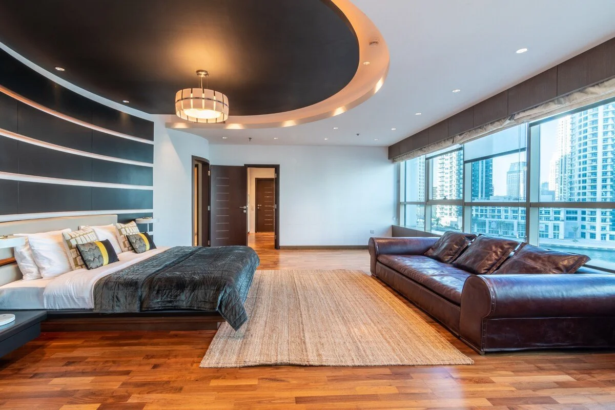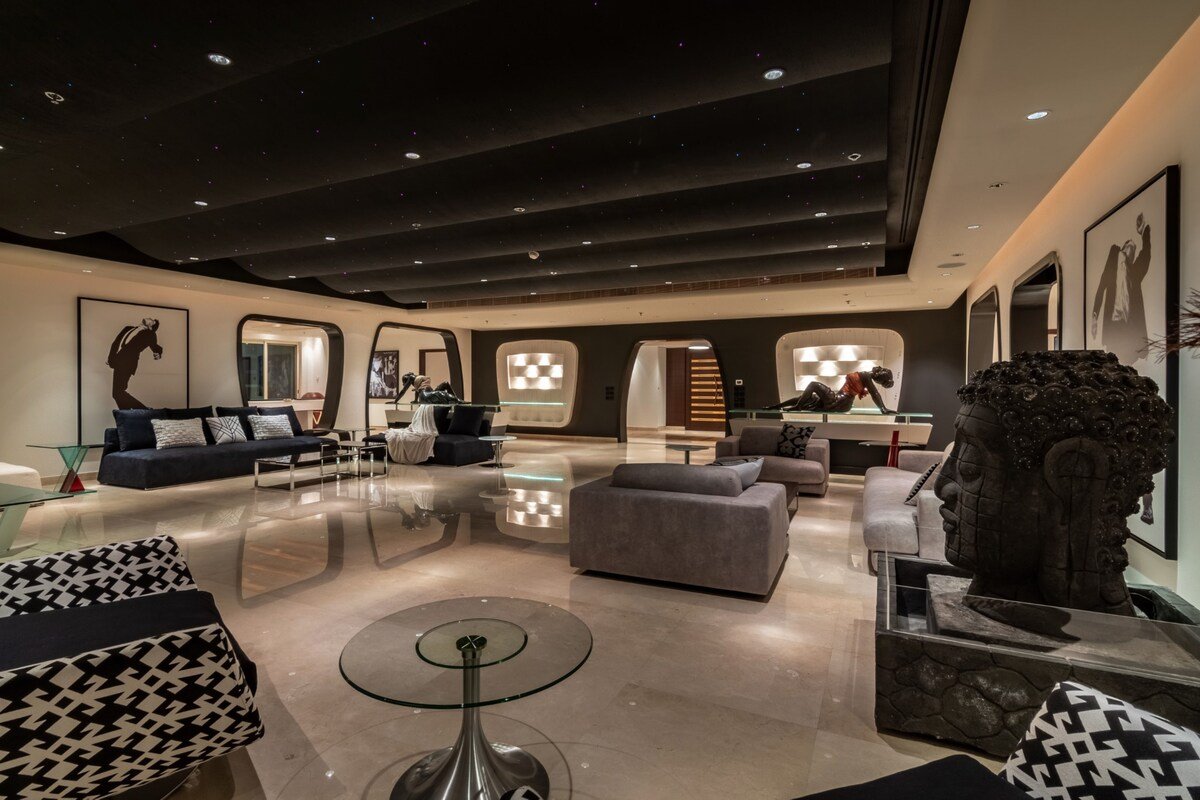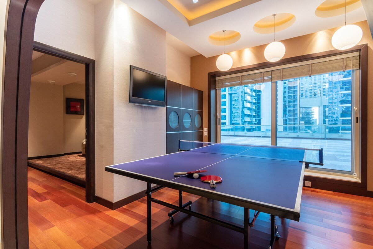 Penthouse Lojo is a full‑floor residence crowning a tower in Dubai Marina. Designed for large groups or families, it spans an entire level and boasts floor‑to‑ceiling windows that frame panoramic views of the marina and city skyline. The open‑plan layout features a vast living room with multiple seating areas, a dining table for 12 guests and a separate lounge with a billiards table and bar. A closed gourmet kitchen supports both casual meals and formal entertaining, while a maid’s room adds convenience for long stays. Contemporary interiors blend neutral tones with sleek finishes, and a wrap‑around balcony invites outdoor lounging above the waterfront. Residents also enjoy access to the building’s shared pool, gym and sun deck. With its expansive footprint and prime location, Penthouse Lojo delivers a luxurious urban retreat in the heart of Dubai Marina.