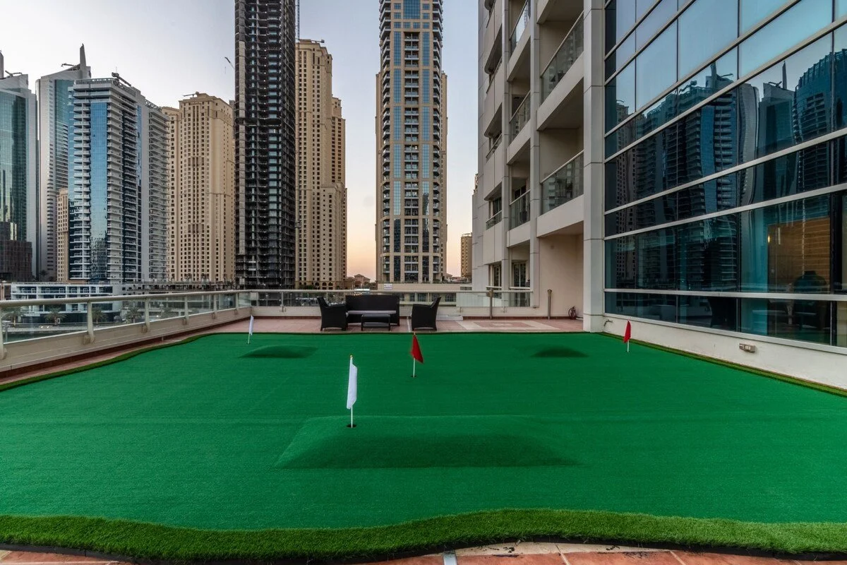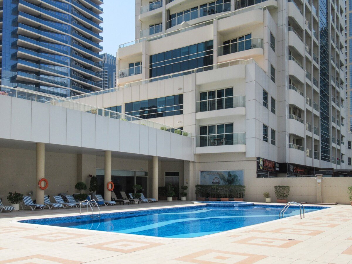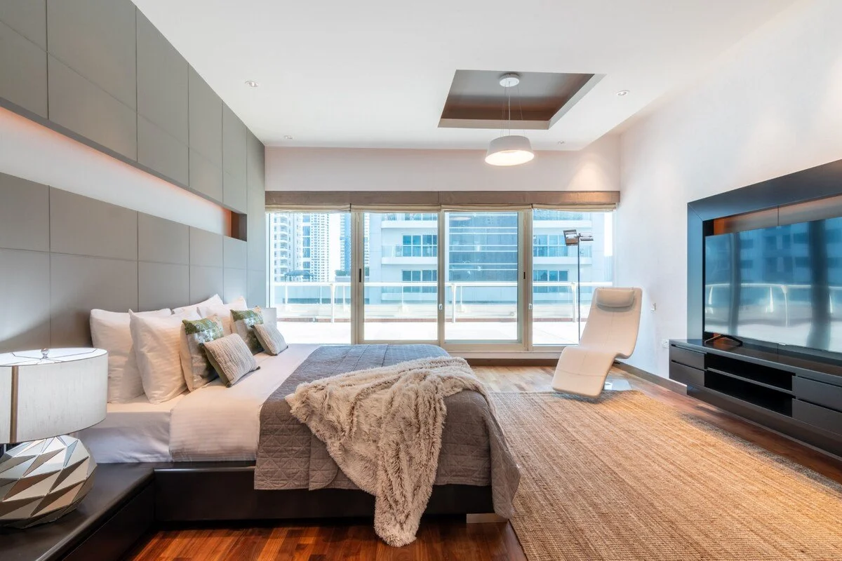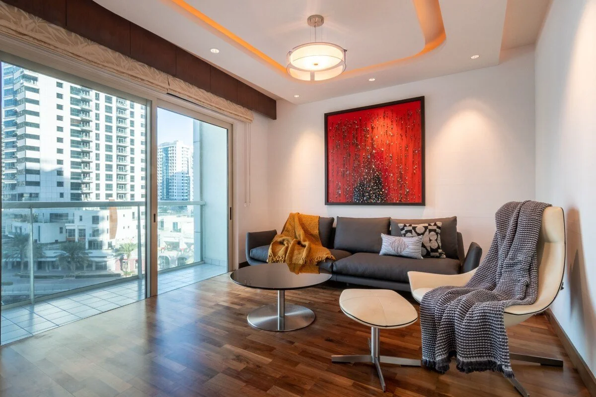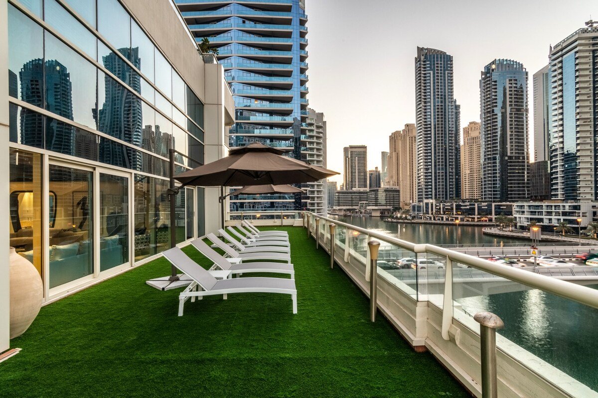 A wrap‑around balcony offers outdoor seating and elevated views over Dubai Marina. Residents also have access to the tower’s communal pool, gym and sun deck for leisure and relaxation.