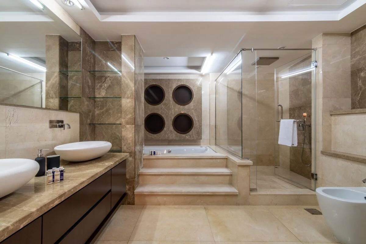 Five spacious bedrooms (several with king beds) accommodate up to twelve guests. Each room features high‑quality linens, built‑in wardrobes and either an en‑suite or adjacent bathroom.