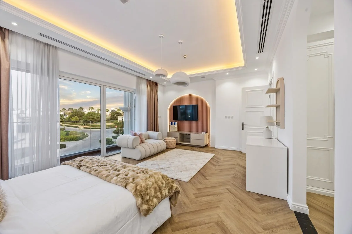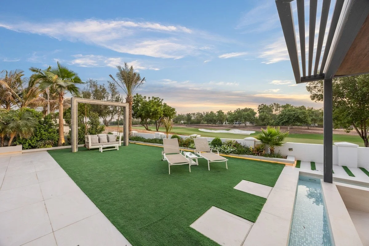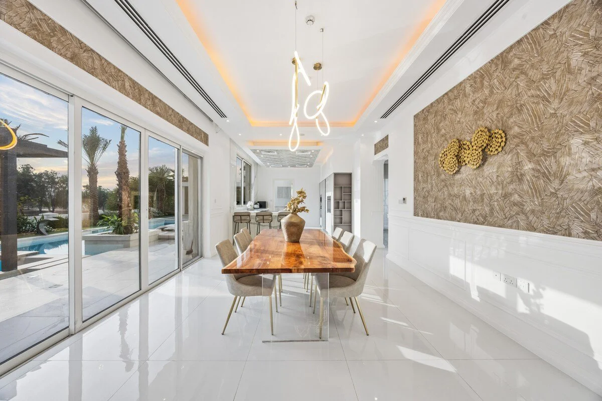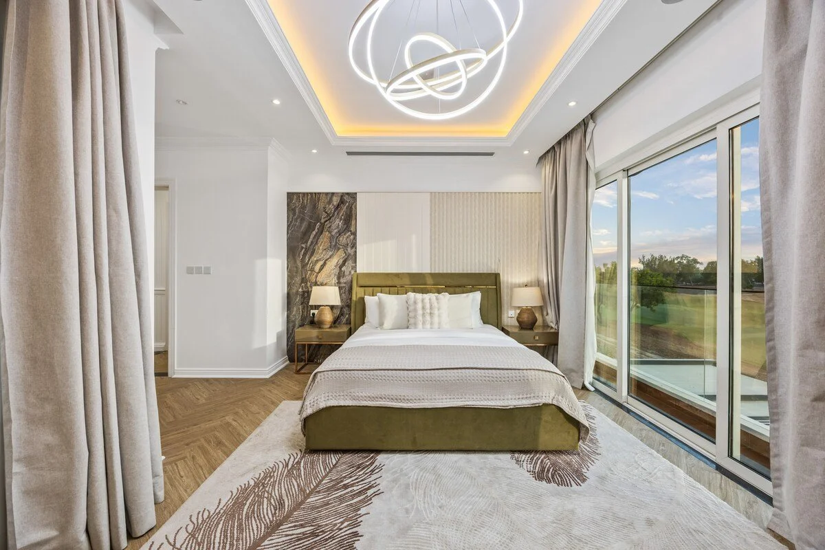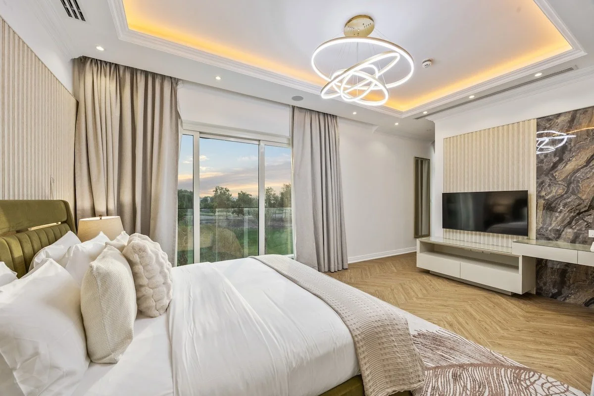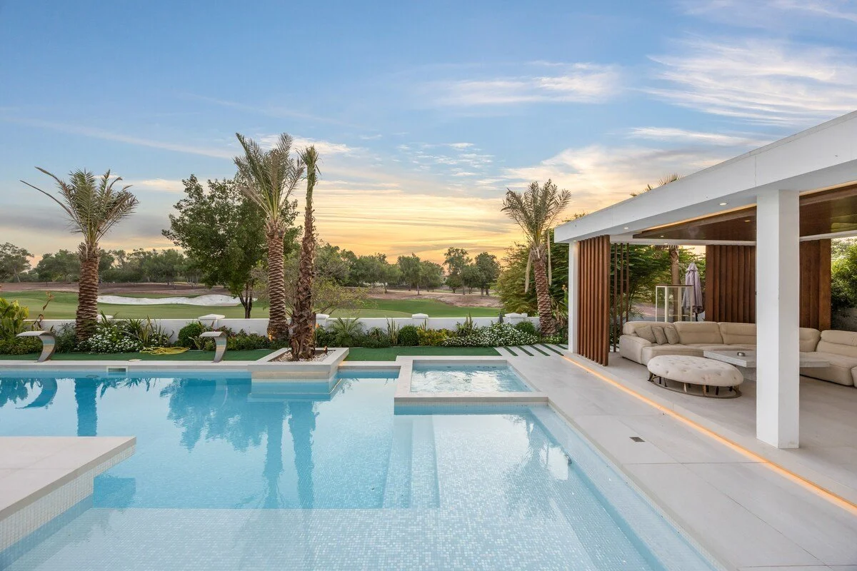 Nestled within the lush greenery of Jumeirah Golf Estates, Villa Calyra exudes sophistication and tranquility. Overlooking the Earth Course, this elegant residence blends contemporary comfort with classic design. Ideal for families or groups, it provides a resort-like lifestyle within one of Dubai’s most secure gated communities.