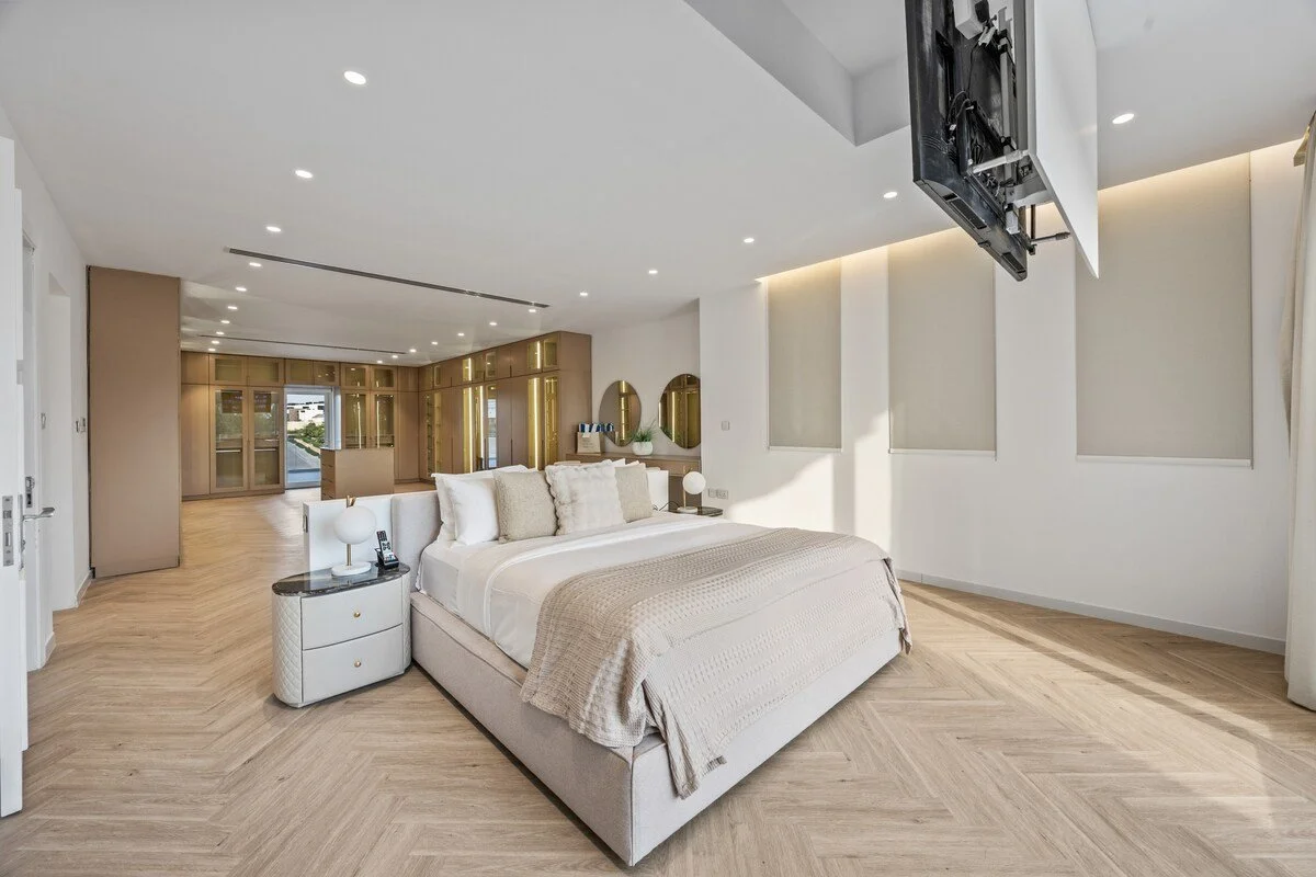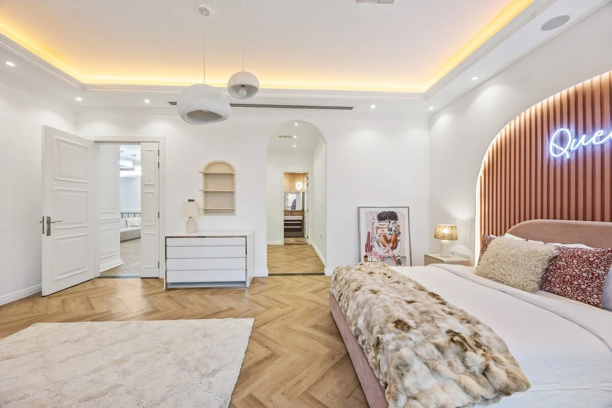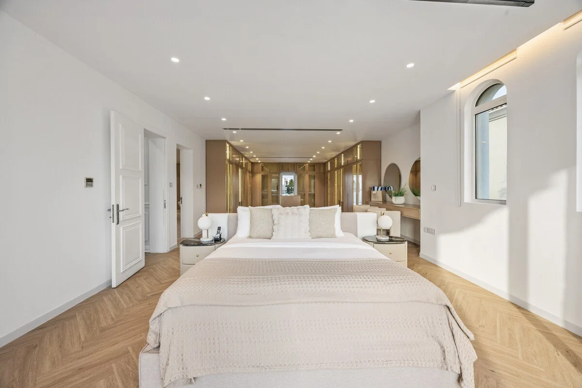 5 elegant bedrooms, each with ensuite bathrooms, king-size beds, and built-in closets. The master suite includes a private balcony with garden view, a walk-in closet, and a luxury marble bathroom.