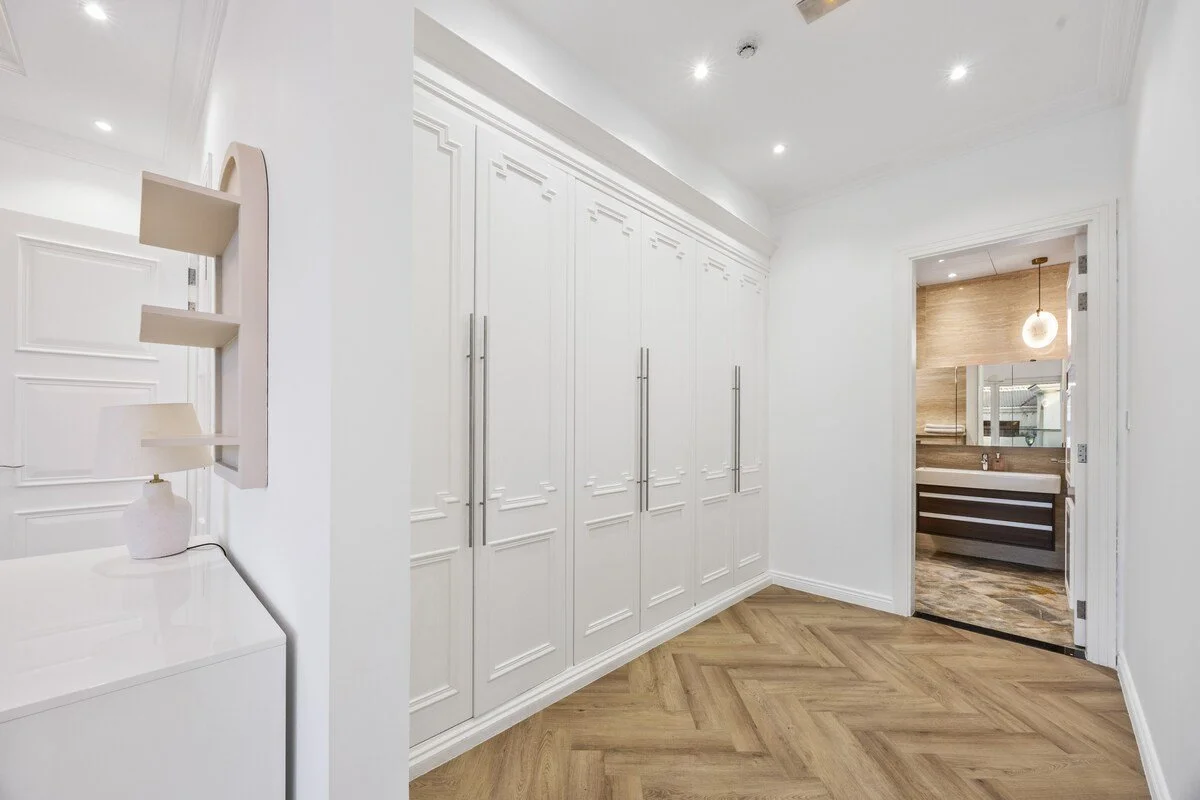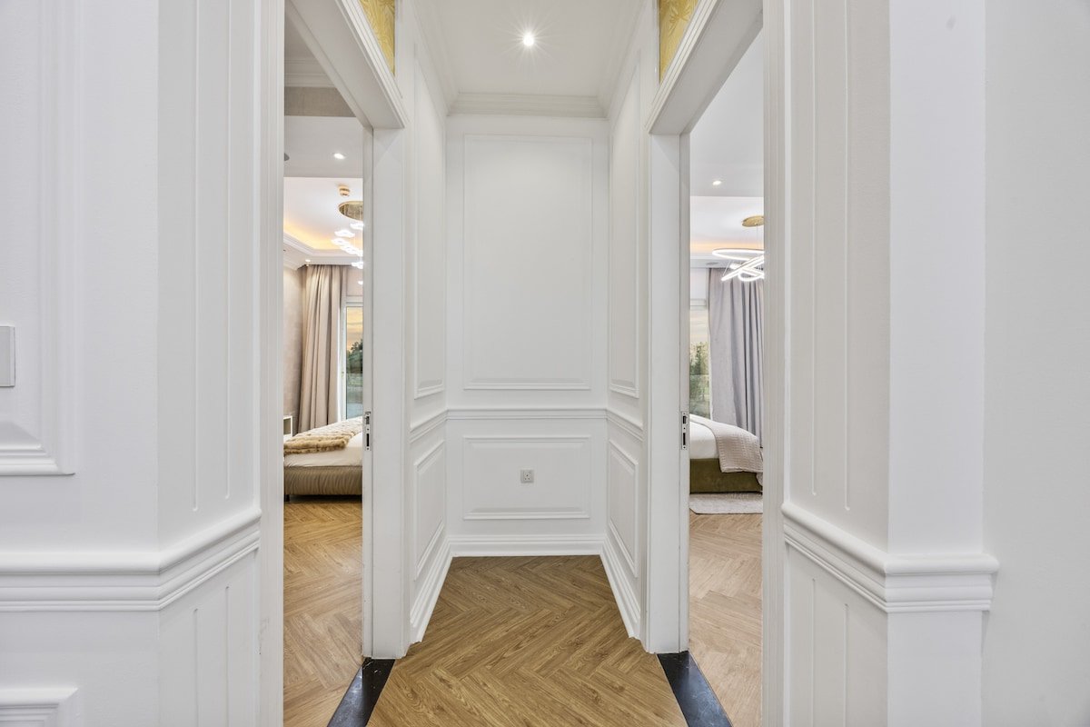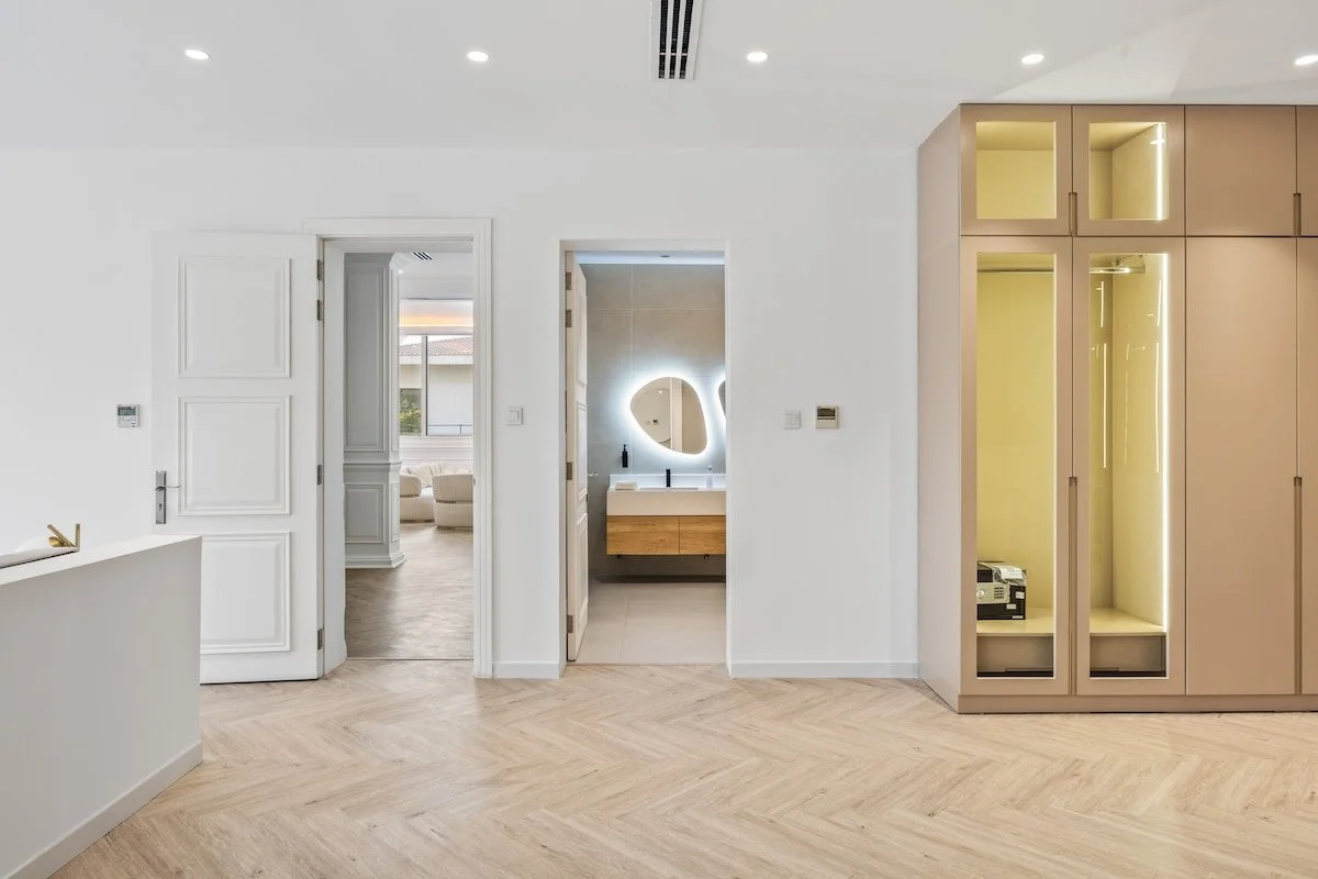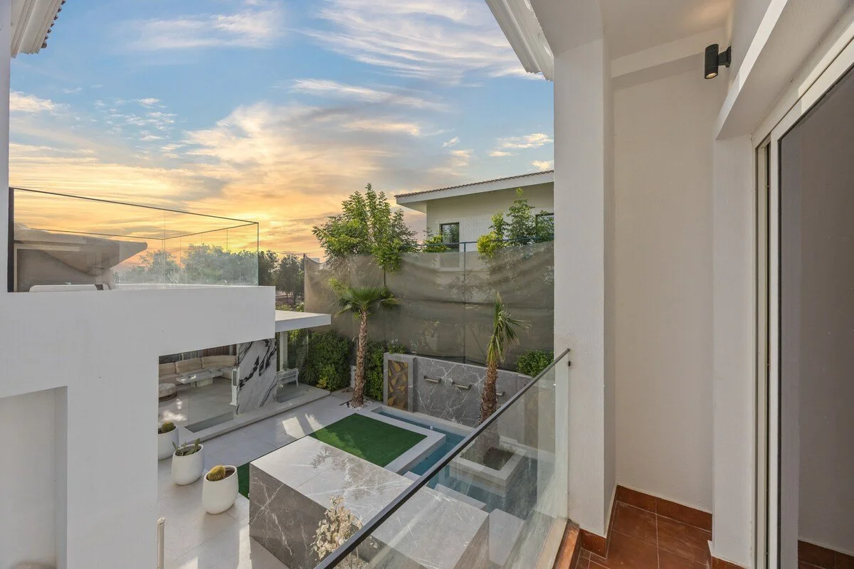 5 elegant bedrooms, each with ensuite bathrooms, king-size beds, and built-in closets. The master suite includes a private balcony with garden view, a walk-in closet, and a luxury marble bathroom.