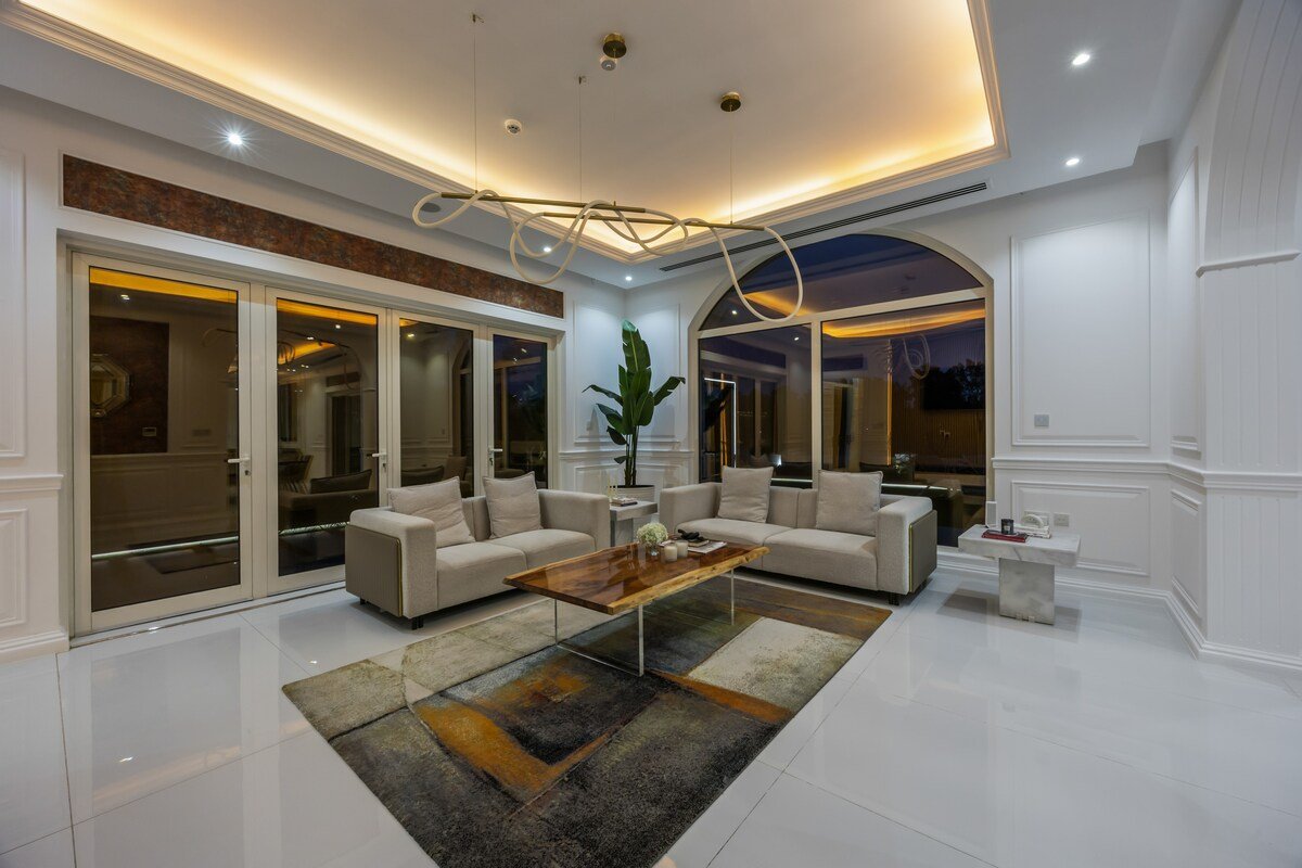 The main living area features floor-to-ceiling windows, a cozy lounge, formal dining area, and open-concept kitchen with premium appliances. Upstairs, a family sitting room offers extra comfort and privacy.