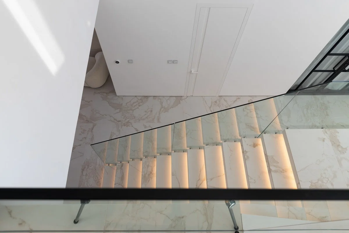 The main living room is decorated with soft neutral hues and opens directly onto the pool terrace. A stylish dining area and a fully equipped modern kitchen make the space ideal for entertaining or hosting a private dinner. Large windows fill the interior with natural light and connect indoor comfort to the outdoor leisure areas.