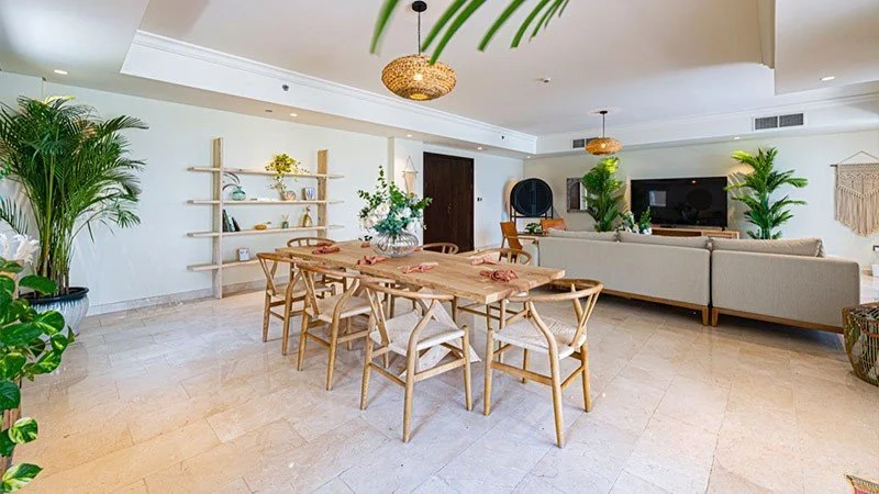 This remarkable seven-bedroom villa combines scale, design, and a prime beachfront setting. An infinity pool overlooking the sea and expansive terraces invite guests to embrace Dubai’s signature waterfront lifestyle. Floor-to-ceiling windows and an open-plan layout flood the interiors with natural light, seamlessly connecting each room to the surrounding greenery and ocean views.